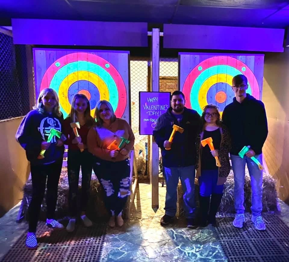 Introducing a new kind of axe throwing in town! Vibrant fluorescent colors under black light. Fluorescent axes flying! Hitting that bullseye, hearing your friends and family screaming, clapping, and cheering you on. You can even bring your own paper targets to hang to throw at. Bring those